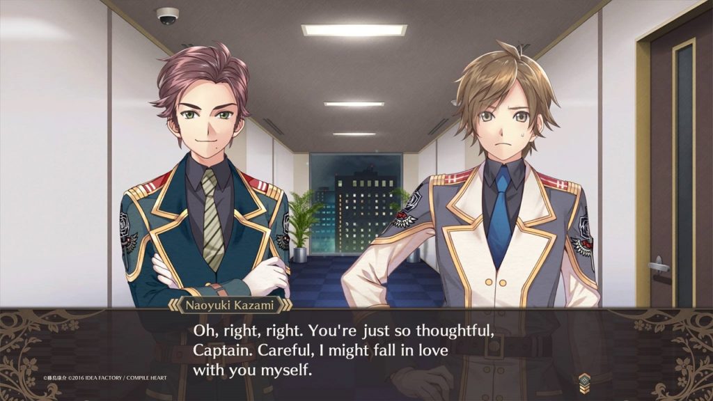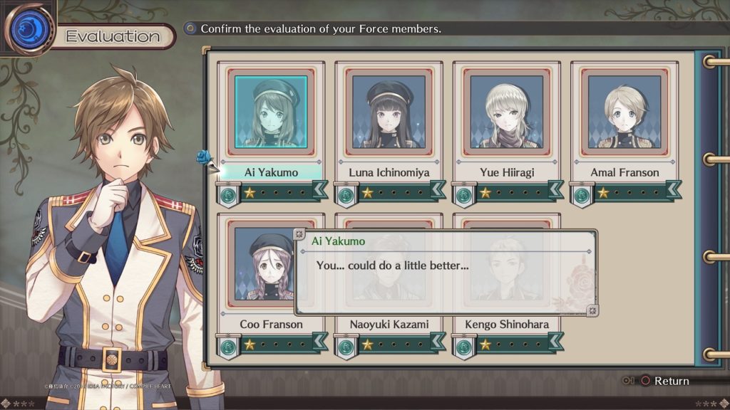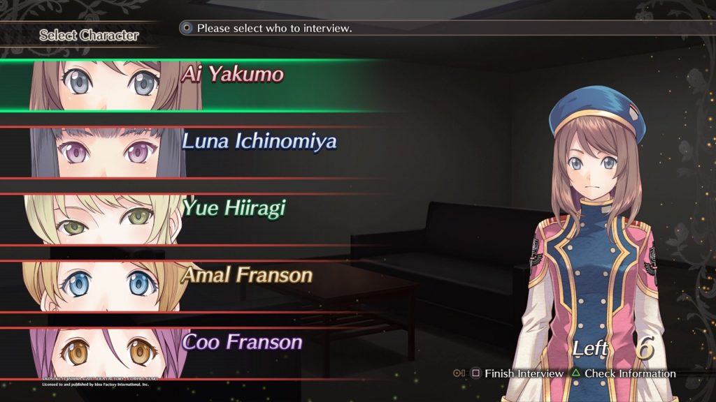 Nel complesso comunque la storia convince, pur senza brillare per originalità, riuscendo ad alternare situazioni di tensione e sospetto a conversazioni ed eventi rilassati, intimi, a volte persino comici. L’evolversi dei rapporti tra i comprimari dipende sia dai già citati banter, in cui la risposta data all’interlocutore determinerà il suo grado di approvazione nei confronti del protagonista, che da una meccanica conosciuta dai fan del franchise Danganrompa: le interviste (o meglio, i colloqui, dato il setting fantamilitare) sono lo strumento attraverso cui il giovane comandante Asashi Shiramine cercherà di smascherare la spia infiltrata all’interno della Squadra Valkyrie.