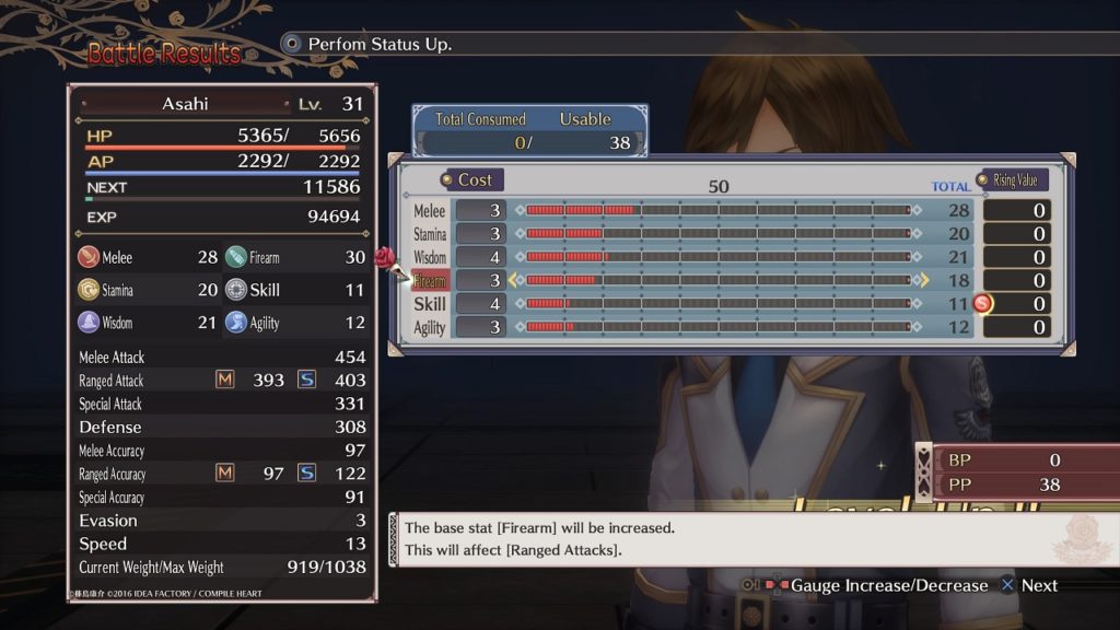 L’altra – e più profonda – componente del gameplay di Dark Rose Valkyrie è, ovviamente, il sistema di combattimento. Ciascuno degli otto membri della squadra dispone di un’arma unica e insostituibile, ma il livello di personalizzazione di statistiche ed equipaggiamento è quasi totale, per quanto ogni comprimario possegga ovviamente i propri punti di forza e debolezza e tipologie d’attacco specifiche.