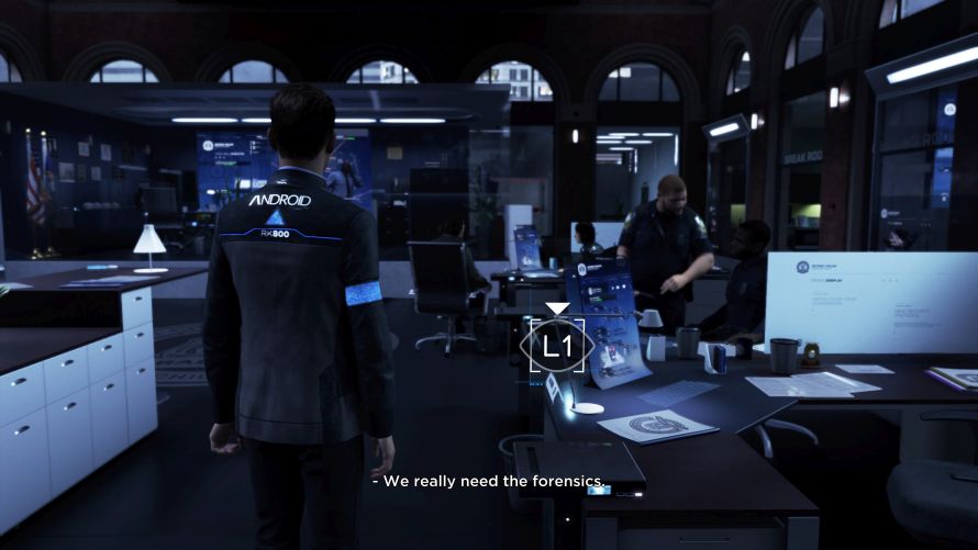 Allo stesso modo, nei rari casi in cui ci si trova a dover ripercorrere i propri passi e risolvere enigmi ambientali per non essere scoperti e catturati, gli aiuti in-game rendono il tutto di una semplicità disarmante. Chi ha giocato a Heavy Rain si ricorderà sicuramente la scena in cui nei panni di Madison bisognava cancellare le tracce del proprio passaggio o, nell’espansione The Taxidermist, esplorare la casa senza lasciare cassetti oppure oggetti fuori posto: in Detroit: Become Human ci sono scene analoghe, ma l’hud richiamabile con il tasto R2 dice sempre cosa fare, quante azioni ci sono ancora da portare a termine e quale obiettivo perseguire dopo. Insomma, una sorta di esperienza guidata che toglie quella patina di incertezza e rischio che si poteva provare soprattutto in Farenheit e Heavy Rain che, unitamente alla mancanza di gameplay attivo come invece c’era in Beyond, rende davvero questo gioco-film tanto film e poco gioco, annullando quasi del tutto la parte ludica dell’esperienza.