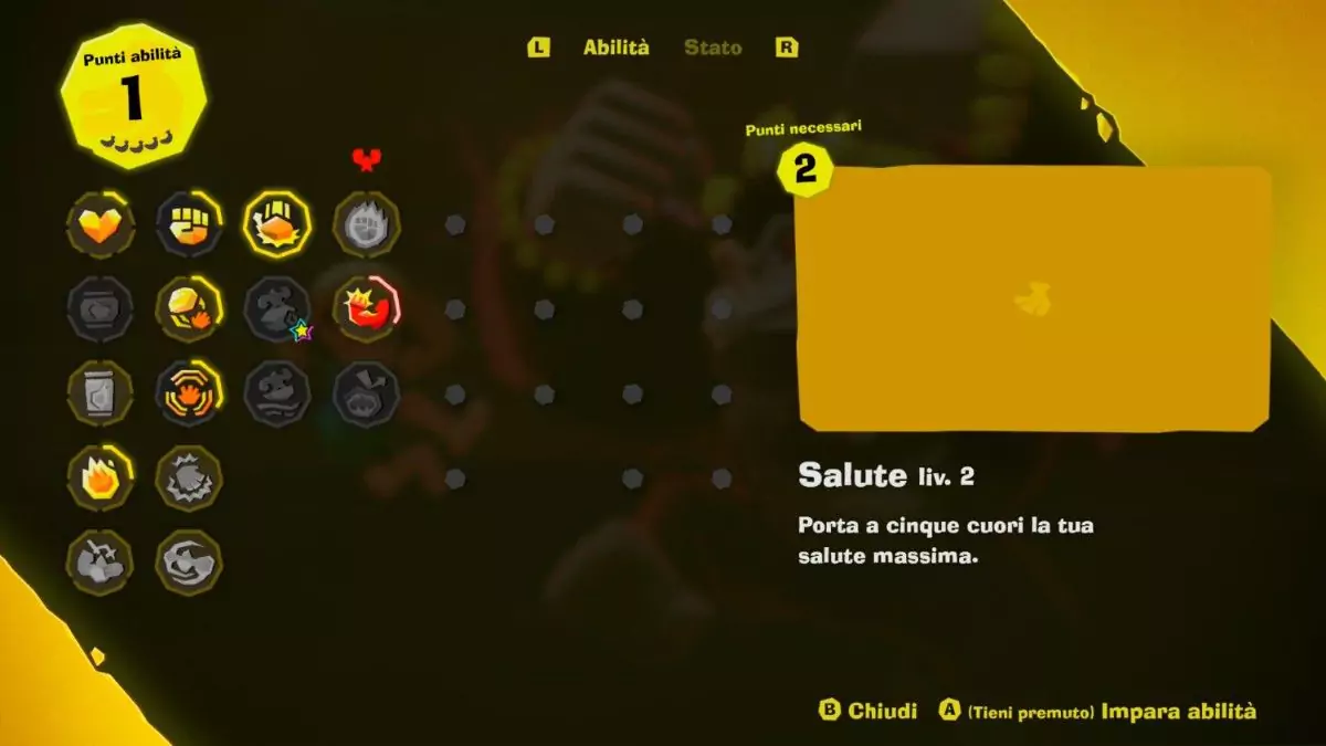 Raccogliendone 5 si otterrà un punto abilità, spendibile in uno speciale albero che ricorda da vicino quello dei giochi di ruolo, da cui poter potenziare un’abilità già appresa o sbloccarne una nuova. Parliamo in questo caso di punti salute, durata delle trasformazioni aumentata, forza dei colpi migliorata ecc. Questo sistema di potenziamento aggiunge uno strato di profondità e personalizzazione, consentendo ai giocatori di adattare DK al proprio stile di gioco.