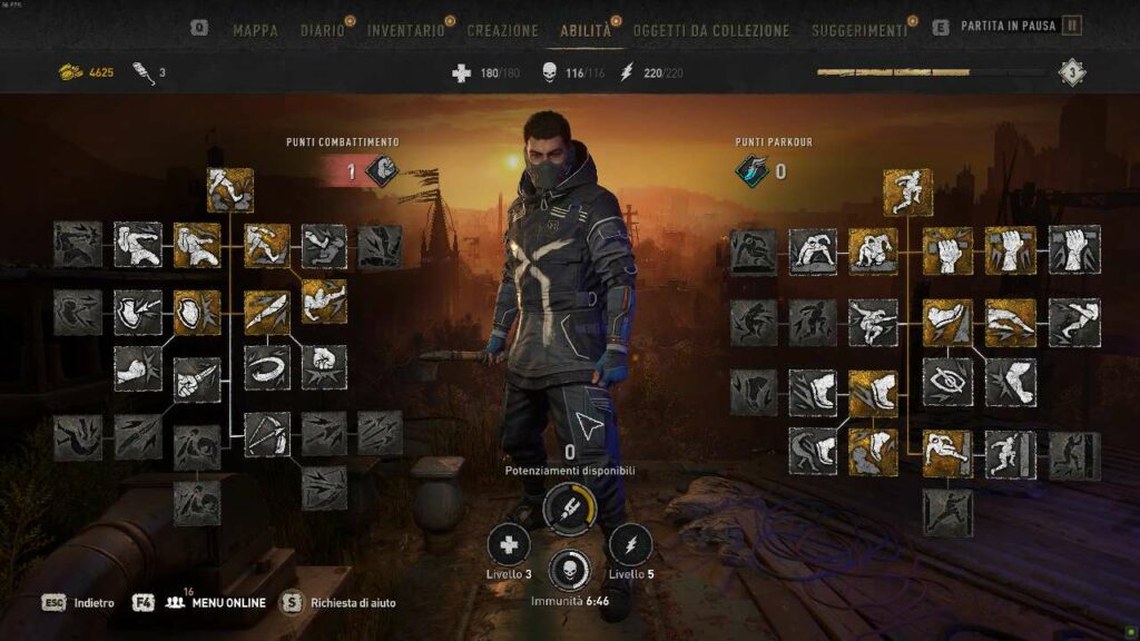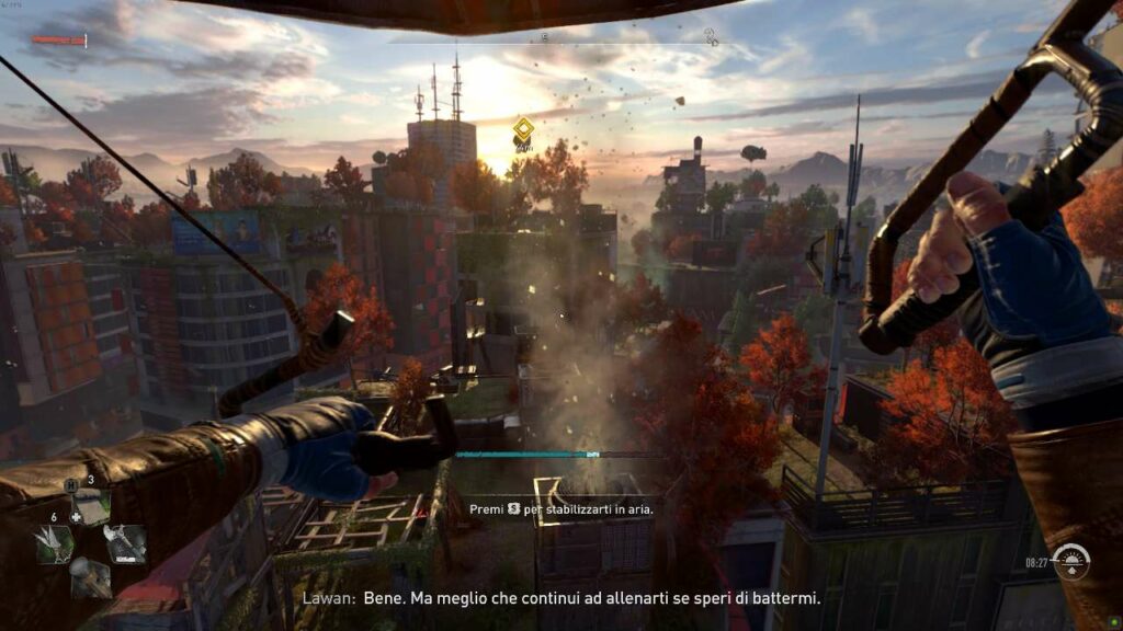 Uno degli aspetti più divertenti e godibili di Dying Light 2 è sicuramente il parkour. Veloce, dirompente e personalizzabile con un albero di abilità variegato. La gestione della stamina non sarà dalla parte del giocatore nelle prime fasi di gioco, motivo per cui vi consigliamo caldamente di potenziare fin da subito quel tratto per correre e scalare con più facilità.