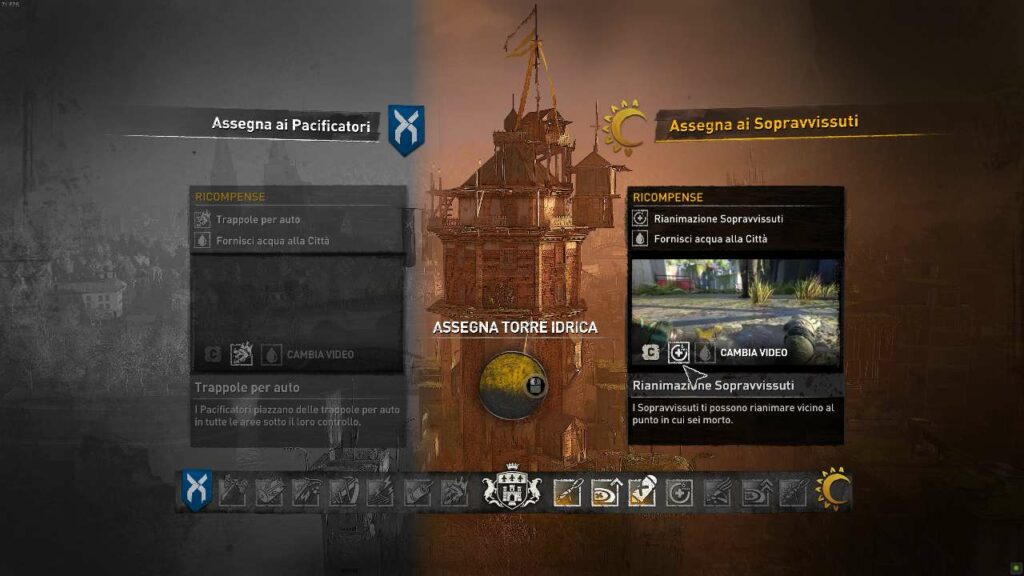 Favorire il controllo di una fazione a discapito dell’altra è una meccanica di gioco che ha impatti minimi nella città di Villedor e che all’atto pratico ci permetterà di avere vantaggi per gli spostamenti parkour (se si favoriranno i Sopravvissuti) o trappole contro gli infetti (se daremo sostegno ai Pacificatori).