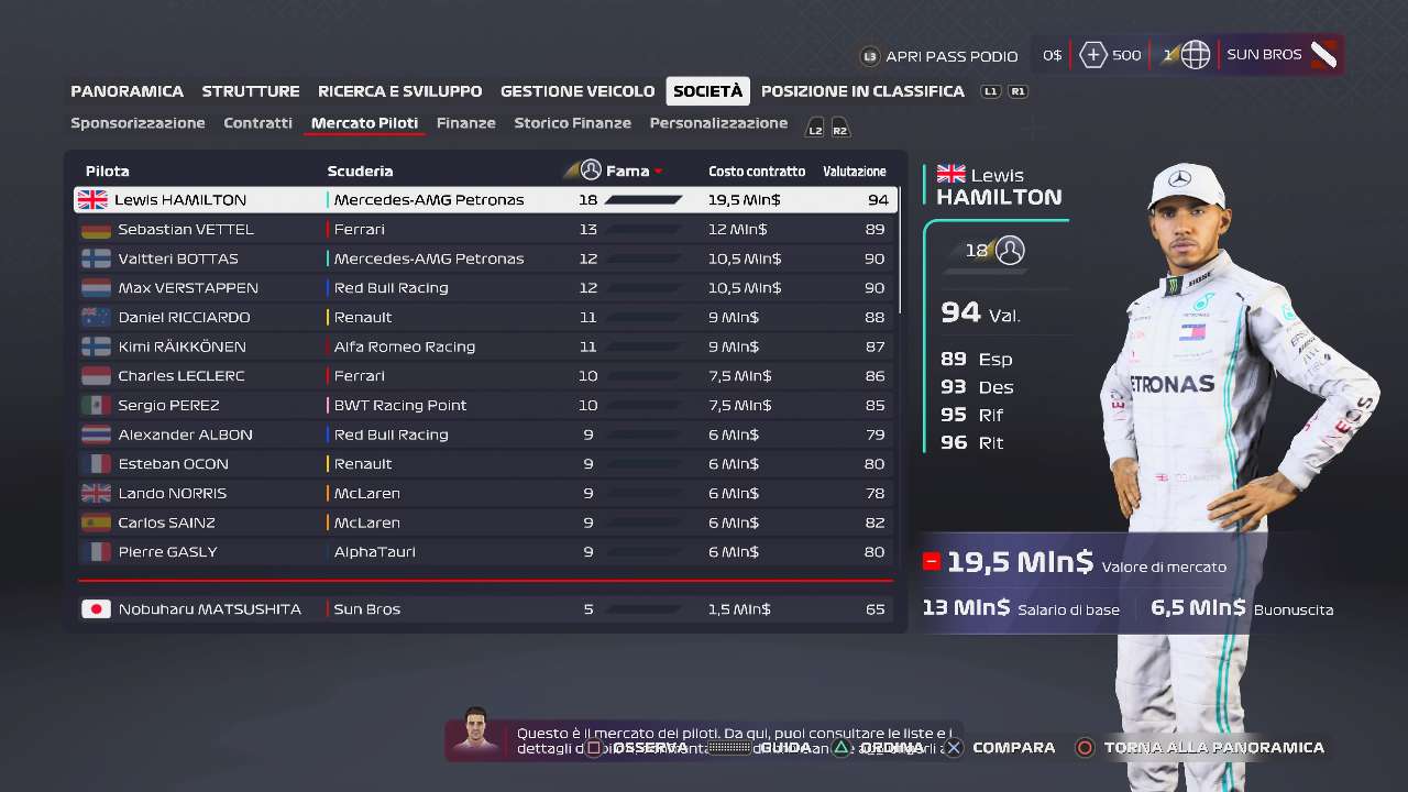 Potete dunque decidere di puntare forte sull’aerodinamica, sul potenziare il motore o il telaio, per avere una maggiore stabilità in pista, e così via, e tali scelte si riversano pesantemente sul gameplay, in cui abbiamo notato quanto lo sviluppo sia in grado di cambiare lo stile di guida in base alle scelte compiute. Chiaramente, essendo una visione complessivamente “manageriale” dell’iterazione, un altro aspetto fondamentale è quello relativo alla scelta del pilota da affiancare al nostro avatar, che fa sia da proprietario sia da “prima donna” nel team. Ciò è però legato sia alla disponibilità economica sia e soprattutto alla fama della Scuderia.