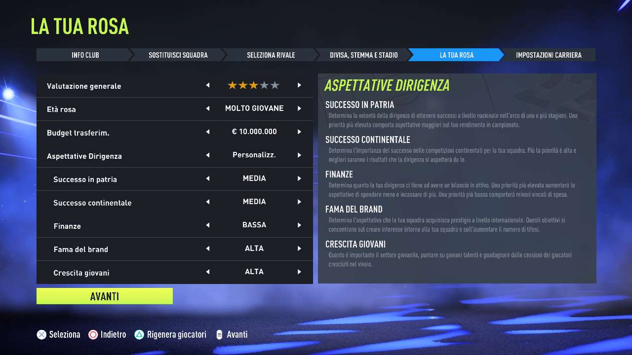 In questa fase è possibile andare a modificare parametri importanti quali il potenziale della squadra, l’età media e le aspettative dirigenziali, creando così un ecosistema personalizzato e appagante per tutte le tipologie di giocatori. Le differenze generate da queste diverse impostazioni, sul lungo periodo, sono certamente tutte ancora da valutare ma possiamo già dirvi che abbiamo avvertito fortemente la sensazione di “partire da zero” generata da questa nuova modalità di affrontare la carriera, a cui è doveroso approcciarsi in maniera più intelligente e “manageriale”, andando a tenere sotto controllo tutta la gestione della squadra.