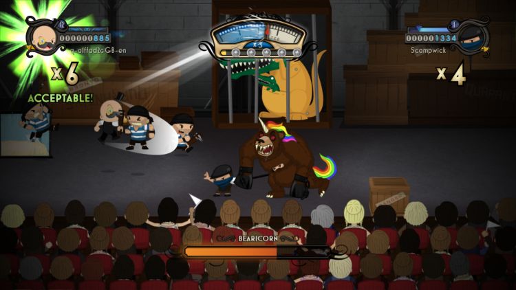 Come già anticipato, l’intera esperienza di gioco è ripresa con una visuale in terza persona, con l’azione a scorrimento orizzontale e la telecamera che inquadra il palco sul quale si svolge l’azione insieme alle prime file di spettatori. Questa sorta di cornice ha permesso agli sviluppatori l’inserimento di elementi estranei a quello che avrebbe dovuto essere l’azione vera e propria, allo stesso modo di quanto potrebbe accadere in un vero spettacolo a teatro: sono soventi i divertenti siparietti in cui le luci si soffermano su di un inserviente che sta preparando la scena successiva, così come vi capiterà spesso di vedere i nemici appena battuti scendere dal palco e recarsi di soppiatto dietro le quinte. Si tratta di una sorta di dimensione intermedia, tipica di una concezione metafisica del mondo videoludico che inserisce così una sorta di terza dimensione tra l’ambiente di gioco e il nostro salotto, cercando come sempre più spesso accade di abbattere quella invisibile barriera che vede la realtà essere totalmente distaccata da quanto accade sullo schermo. Sotto questo aspetto il team di Mediatonic ha sicuramente centrato il bersaglio, realizzando un prodotto interessante e pienamente godibile.