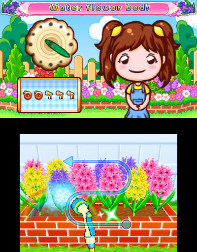 Per muoversi all’interno del mondo di gioco si utilizza l’analogico del Nintendo 3DS, mentre con lo stilo della console andremo a selezionare i vari elementi, come le aiuole, una delle parti più importanti del gioco, se non la più importante. Selezionando “cura piante” si aprirà un menù con diverse opzioni, tra cui “pianta”, “acqua”, e “richieste”. Come è facile intuire, con le prime due andremo a piantare i semi ottenuti durante il completamento dei mini giochi, che dovranno poi essere ovviamente annaffiati, azione che peraltro costituisce a sua volta un’attività, in quanto dovremo dosare la quantità d’acqua da riversare sui semi. “Richieste” invece ci permetterà di tenere d’occhio le mansioni da portare a termine per i negozianti. Un esempio è quello di coltivare un determinato numero di carote, curarle affinché possano crescere, e infine consegnarle a Orso per il suo ristorante. Per far sì che le piante crescano, oltre ad annaffiarle, dovremo far passare un determinato numero di giorni, che cambiano a seconda di quello che abbiamo seminato. A fine di ogni giornata Mama ci darà un recap dell’affluenza dei clienti nei vari negozi. Non possiamo infine non citare alcuni eventi casuali come il difendere le piante dai parassiti, e la fiera che comparirà per permetterci di spendere una valuta speciale, dandoci la facoltà di vincere altrettanti oggetti speciali con cui abbellire il giardino.