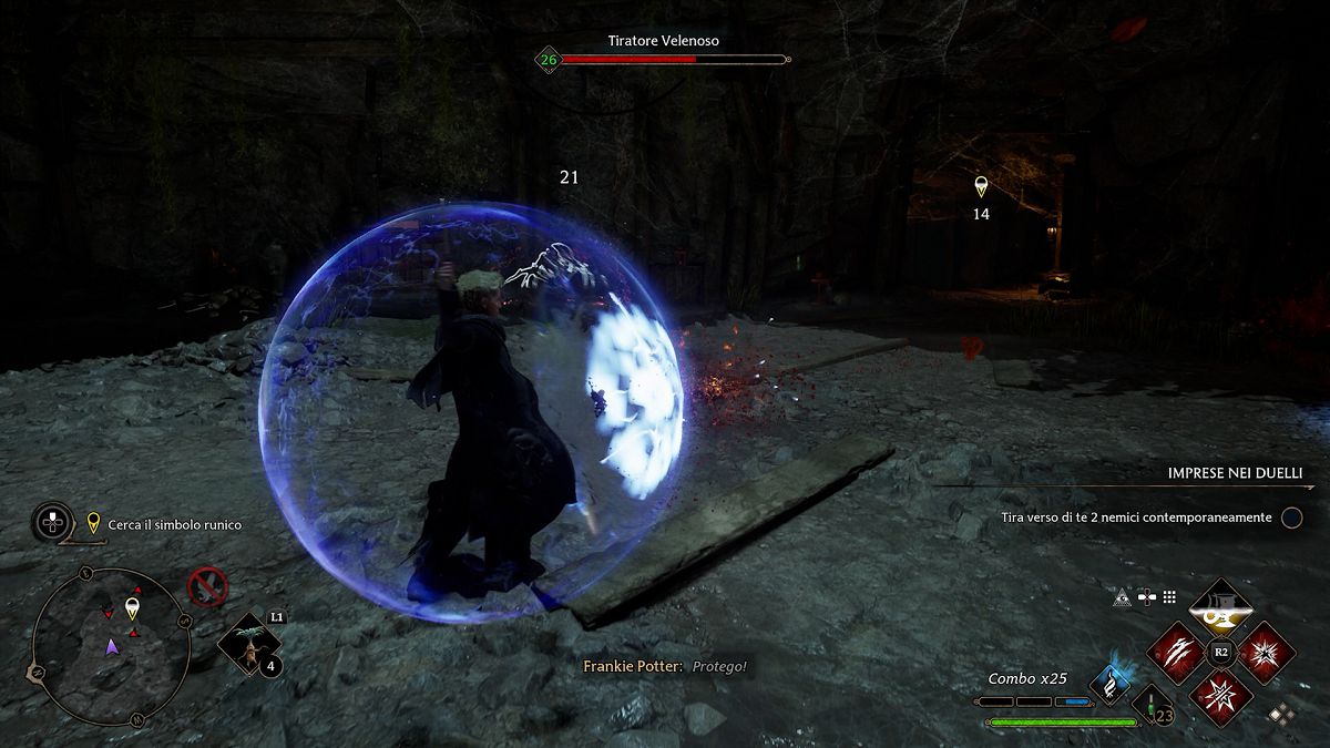 Ogni magia avrà un colore distintivo che potrà essere usato per rompere gli scudi dei nemici al fine di infierire con combo che mescolano attacchi base (con la semplice pressione del tasto R2) e incantesimi. Ad esempio, si potrebbe far levitare un nemico colpendolo con Levioso per poi infierire una serie di attacchi base e poi portarlo a noi con un colpo di Accio e perpetuare una nuova combo di attacchi e infine scagliarlo lontano con un Depulso.