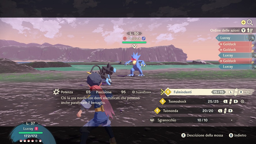 L’impalcatura dei combattimenti a turni permane, ma quella di Leggende Pokémon: Arceus è intrisa di elementi modificati e altri inediti. Innanzitutto è bene capire che la superiorità di un Pokémon rispetto a un altro non dipende totalmente dal suo livello, a meno di notevoli gap; a giocare un ruolo importante sono gli Strumenti Impegno, che aumentano le singole statistiche e possono essere trovati sparsi per le mappe. Ne consegue che ognuno ha i mezzi per sconfiggere pure un Pokémon Alfa – versione più forte di quelli comuni – di dieci livelli superiori, se usa bene le proprie carte. Senza annullare l’importanza di questo aspetto, si tratta di un accorgimento che rende i combattimenti più accattivanti e allo stesso tempo più impegnativi, per merito anche di un cambiamento nel sistema delle mosse. Scordatevi il Ricordamosse e le Squame Cuore, ora le abilità possono essere acquistate, assegnate da un menù e alternate senza andare perse, aggiungendo un ulteriore pizzico di strategia. Anche le evoluzioni sono demandate al giocatore, così da potere decidere in libertà il momento propizio.