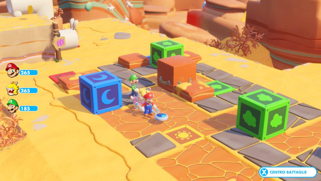 Ritornando alle abilità, tutte necessitano di un tempo di recupero che dura diversi turni. La parte interessante è che nel proseguo della campagna anche i nemici saranno dotati di abilità simili a quelle degli eroi, richiedendo al giocatore un maggiore livello di attenzione a tutte le possibili variabili degli scontri. In definitiva Mario + Kingdom è un titolo che offre un ottimo livello di sfida, non al pari di altri esponenti del genere, ma tuttavia bastevole per i neofiti (è inoltre presente una modalità facile per le sessioni più frustanti: attivando l’opzione prima di uno scontro tutti gli eroi avranno l’energia vitale aumentata del 50%).