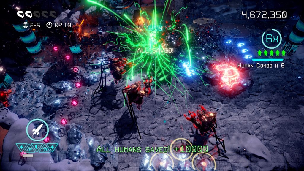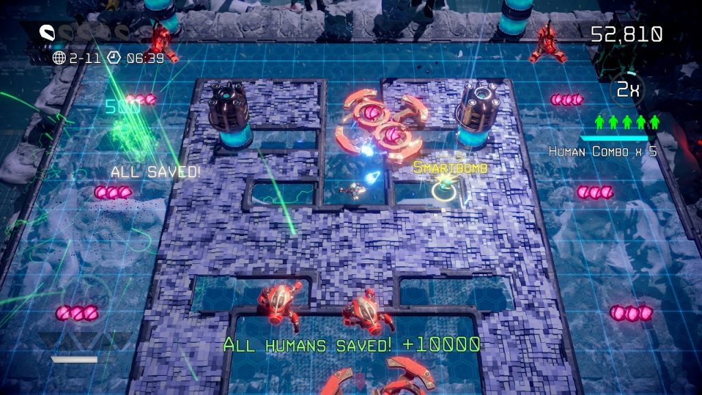 Questi ultimi si troveranno davanti a un’altra, forse più ardua sfida per la propria pazienza: la difficoltà di Nex Machina è nettamente superiore alla media videoludica fin dalla modalità Principiante, al punto che ad oggi solo il 20% dei possessori del gioco è riuscito a terminare a quella difficoltà i 5 brevi, ma intensi mondi della modalità Arcade. Questa prevede una sfida consecutiva, livello dopo livello, di orde su orde di alieni e macchine ostili da abbattere ed esseri umani da trarre in salvo.