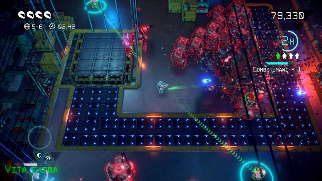 I mondi legati agli eventi di trama sono 5, ma esistono anche battaglie opzionali ed estremamente più ostiche, da sbloccare salvando gli “umani segreti”, ben nascosti all’interno delle mappe. Oltre alla già citata e classicissima modalità Arcade, Nex Machina offre la possibilità di esercitarsi nella modalità Mondo Singolo, di mettersi alla prova con le sfide stagionali dell’Arena, o di condividere il titolo in compagnia di un proprio amico grazie alla Co-op locale. Le classifiche globali permettono di osservare e imparare dai migliori, grazie alla presenza di un replay del gameplay di ciascun classificato all’interno di ciascun livello.