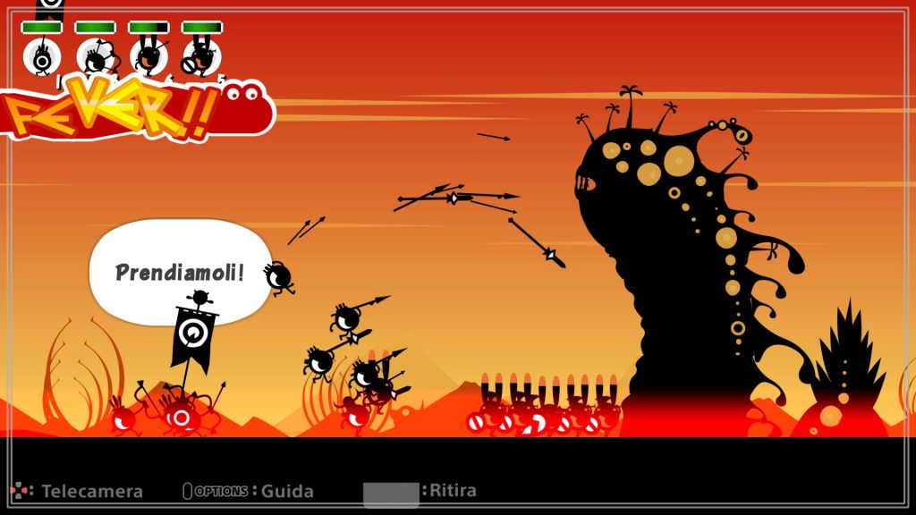 Va da sé che il comparto audio di Patapon Remastered è azzeccatissimo e riesce a coinvolgere con le sue melodie ritmate a livello viscerale come solo i tamburi riescono a fare, spingendo non di rado a seguire il ritmo anche fisicamente; man mano che lo stato Fever viene mantenuto. Le tracce musicali si arricchiscono di voci e strumenti di accompagnamento, in un crescendo che fomenta il giocatore e al contempo ne abbassa la concentrazione, aumentando le probabilità che sbagli un passaggio e debba ricominciare la catena di combo d’accapo. Insomma una maniera deliziosa e infame di rendere il gioco via via più complicato.