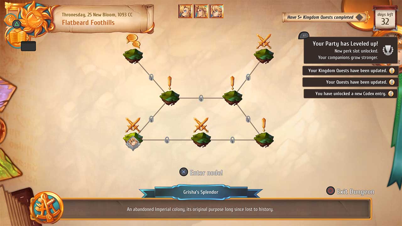 Questi ultimi sono composti da “nodi” da conquistare; in base alla tipologia, il nodo consiste in una già citata missione di natura testuale (i cui esiti diventano sempre più imprevedibili man mano che si avanza nei dungeon più complessi), in un accampamento in cui riposare, salvare la partita e scambiare due chiacchiere coi compagni di squadra o, ovviamente, in battaglie all’ultimo sangue. Gli scontri di Regalia: Of Men and Monarchs si rifanno allo stile tattico con visuale isometrica e richiedono al giocatore di soddisfare determinate condizioni per ottenere la vittoria, non sempre legate al puro e semplice massacro di ogni creatura ostile sul campo di battaglia.