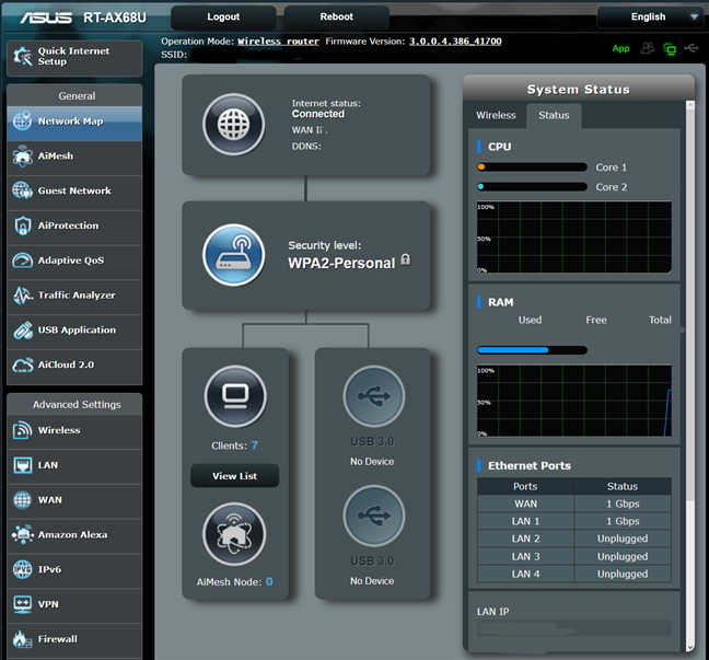Facendo una panoramica delle caratteristiche hardware principali, possiamo dire che l’ASUS RT-AX68U è spinto da un processore Broadcom BCM4906 dual-core, con frequenza di 1,8 GHz, 512 MB di RAM e 256 MB di memoria firmware. Essendo un router dual-band, la larghezza di banda teorica massima viene ripartita come segue: 861 Mbps sulla banda a 2,4 GHz e 1802 Mbps quando si utilizza la banda a 5 GHz, mentre entrambi utilizzano lo standard Wi-Fi 6.