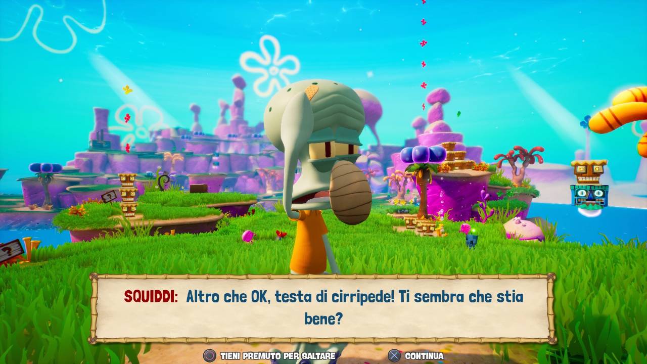 Non ci aspettiamo l’assenza di caricamenti che ci ha dimostrato la nuova generazione di console, ma almeno una rivisitazione dell’hub di gioco per garantire un processo più fluido non ci sarebbe dispiaciuto e avrebbe reso ancora più moderna l’intera esperienza, anziché mantenere quella sensazione di letterale gioco per Playstation 2 esportato su Playstation 4. Più giocherete a SpongeBob SquarePants: Battle for Bikini Bottom – Rehydrated più inizierete a dimenticarvi di questi problemi, che sì, sono evidenti, ma rappresentano in parte l’anima del gioco, che vi inonda con sketch comici, citazioni, incontri con personaggi della serie animata e fasi platform difficili, talvolta estremamente punitive che vi faranno lentamente chiudere occhi e mente lasciandovi travolgere dalle emozioni e sensazioni di quando si giocava spensierati e senza preoccupazioni su Playstation 2.