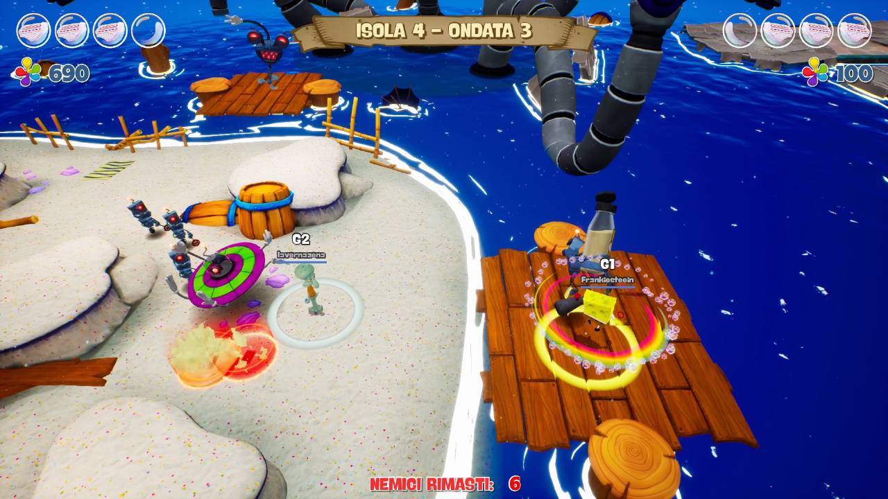 Una delle principali novità di SpongeBob SquarePants: Battle for Bikini Bottom – Rehydrated è l’introduzione di una modalità multigiocatore, sia locale che online, per due giocatori. Questa modalità nasce per riportare in vita alcuni elementi tagliati dal titolo originale come la boss fight contro Robo-Squiddi (che ci saremmo aspettati di vedere nella campagna single-player). L’iterazione multigiocatore prevede un classico scontro di nemici a orde sparsi per diverse isole, ogni cinque isole completate potrete attivare una pedana che distruggerà uno dopo l’altro i tentacoli di Robo-Squiddi, la difficoltà crescente dell’esperienza rende il comparto multigiocatore divertente e mai noioso, seppur fine a se stesso, dato che, un avviso ai cacciatori di trofei, non esiste alcun trofeo legato a questa modalità.