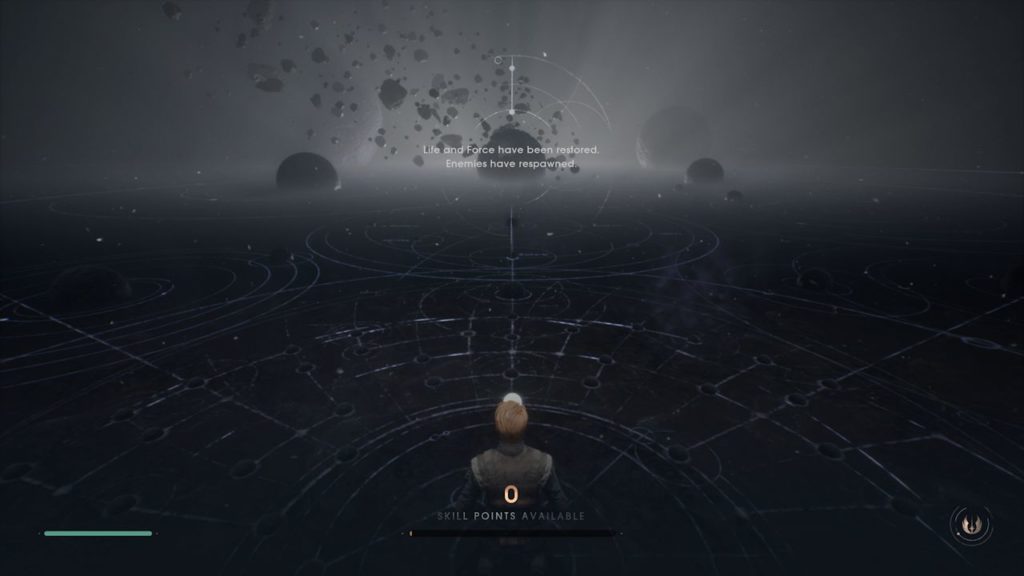 Il giovane Cal in combattimento è in parte coadiuvato da BD-1, un piccolo robot che pur non avendo doti combattive risulta fondamentale: esplorare, aprire casse, scoprire segreti e informazioni sul mondo circostante sono tutte feature appannaggio del piccolo amico cibernetico, il quale risulta necessario anche per quanto riguarda elementi più pratici come il curare il nostro alter ego. Durante la traversata Cal può trovare oggetti che servono ad aumentare le unità di Steam curativi e ampliare l’effetto delle cure stesse, sbloccando apposite abilità dal menù dedicato. Gli elementi in comune con il lavoro di FromSoftware non finiscono qui. Il sistema checkpoint di Star Wars Jedi: Fallen Order è, ad esempio, praticamente il medesimo. Esplorando le mappe è infatti possibile fermarsi a riposare presso alcuni siti di meditazione e toccandoli è possibile rigenerare la propria salute e quella degli oggetti curativi, ma allo stesso tempo si rigenerano anche i nemici precedentemente sconfitti. Dalla serie “Souls”, Star Wars Jedi: Fallen Order recupera anche il sistema di morte e rinascita: una volta sconfitti è doveroso tornare sui nostri passi per poter recuperare tutta l’esperienza maturata precedentemente.