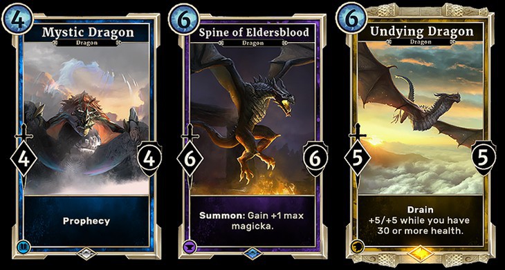 Nel nuovo set non potevano mancare nuove carte Leggendarie in grado di fare la differenza, e infatti si aggiungono alla mischia ben 33 nuove carte. Tra queste è presente anche un drago per ogni colore, ma per coloro che vogliono crearsi un mazzo draconico è immancabile l'”Alduin”, che distrugge tutte le creature in campo ed evoca dal cimitero un drago all’inizio di ogni turno, “Paarthurnax”, che genererà nella nostra mano tre Urli casuali azzerandone il costo, e il “Tumulo del Drago”, carta supporto che tramuta tutte le carte del nostro deck in draghi casuali abbassandone il costo di un punto Magicka.
