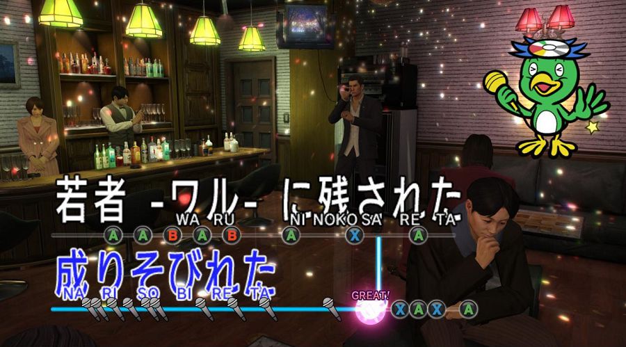 Tutto questo potenziale è un po’ smorzato da tutto il resto del gioco, che seppur molto divertente, lascia fin troppo spazio alla demenzialità delle missioni secondarie e dei mini-giochi. Proprio questi ultimi sono la principale causa di ritardo nel completamento della trama e, visto il loro numero, non è difficile perdere ore in sala giochi, al bowling o, soprattutto, il karaoke. Il karaoke è di fatto la vera anima pulsante del gioco, il suo cuore e il suo corpo. Le coreografie dietro alle canzoni in forma di filmato, la musica stessa e il contesto nel quale la si produce arrivano a far capire che c’è qualcosa oltre alla storia, oltre alla vita, oltre al senso stesso dell’umanità. Peccato soltanto che come mini-gioco sia un po’ troppo grezzo e che può dare un po’ di problemi a causa del metodo con cui si inviano i comandi e si segue il ritmo. Non perché sia difficile, al contrario, ma può venire a noia in fretta ed è fin troppo rigido.