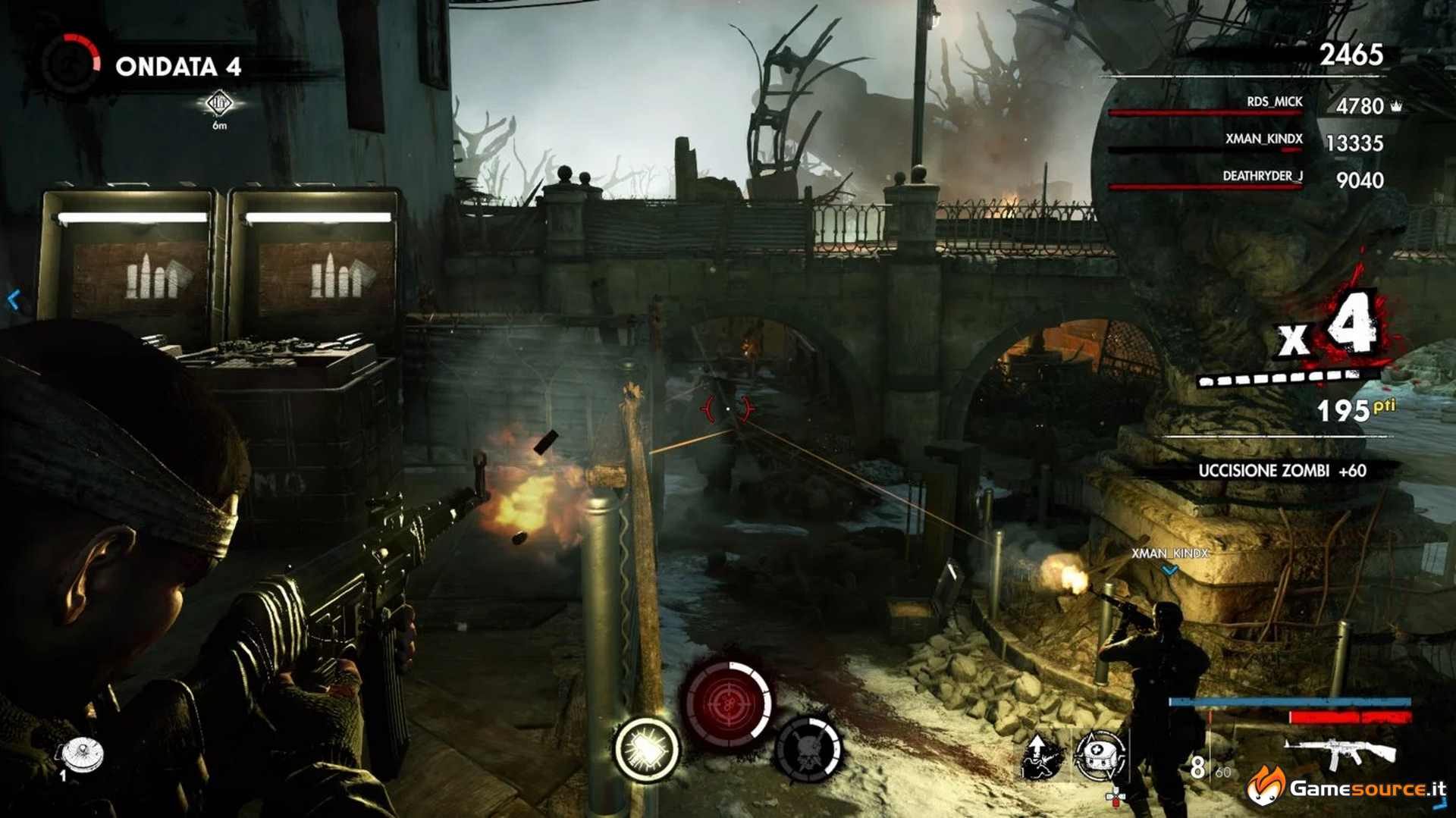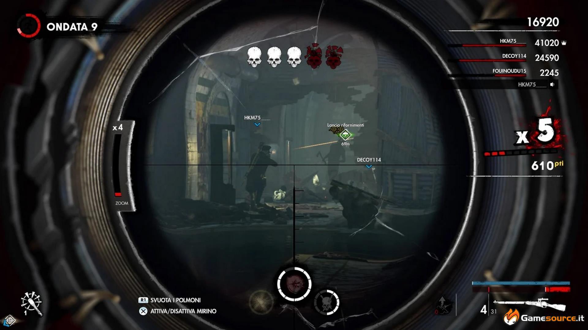 In ogni caso il cecchino ha sempre il suo fascino e in questo Zombie Army 4: Dead War eccelle. Far esplodere due nemici in fila a distanza o vedere fegato, polmoni, ossa, cervello e cuore che, a rallentatore, esplodono sotto i tuoi colpi di precisione è sempre grottescamente affascinante. Il top lo si raggiunge in squadra, quando a coppie o in quattro potrete dividervi i compiti e mentre uno fa fuori quelli pericolosi e distanti l’altro gli guarda le spalle dal brulicare che incombe per poi darsi il cambio e invertire i ruoli.