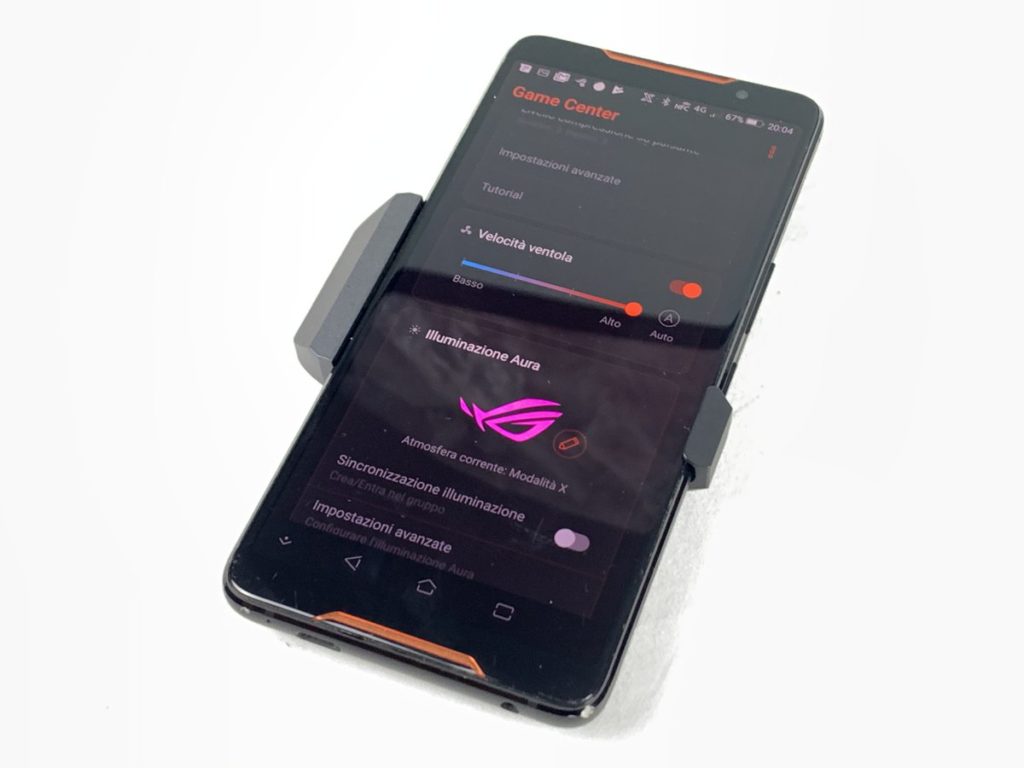 Durante le fasi di gioco intense bisogna però fare un’appunto: nonostante lo smartphone utilizzi un sistema di dissipazione vapor chamber, ovvero a camera di vapore, tende a scaldarsi molto nella parte centrale posteriore. Per questo motivo ci tornerà molto utile la ventola che troviamo all’interno della confezione. Si chiama AeroActive Cooler e andrà a posizionarsi proprio nella parte più calda dello smartphone, in modo da smaltire velocemente il calore e continuare ad avere così prestazioni sempre eccellenti, anche dopo ore di gioco. La ventola riprende lo stile di Asus ROG Phone e siccome, una volta installata, andremo a coprire l’occhio presente sul posteriore dello smartphone, Asus ha deciso di riproporlo anche qui, sempre con illuiminazione RGB.