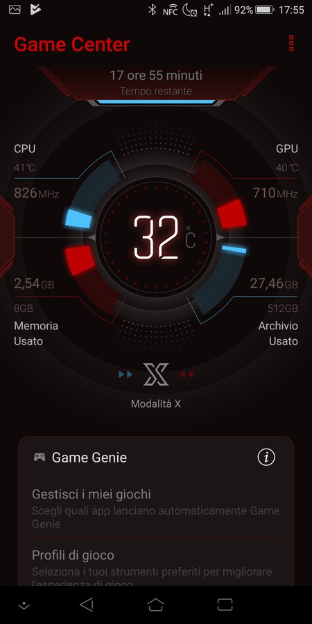 Asus per questo suo ROG Phone ha inserito un’app denominata “Game Center” e sarà il centro di controllo del nostro telefono. Qua possiamo monitore praticamente tutto, velocità di Clock di CPU e GPU con le loro relative temperature, lo Storage disponibile, creare dei profili personalizzati per i videogiochi, controllare la velocità della ventola posteriore, abilitare l’overlay con le informazioni a schermo e attivare la modalità X.