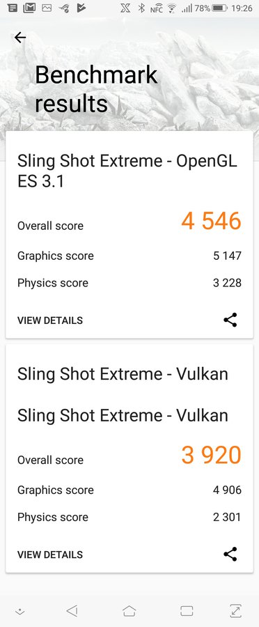 Il primo benchmark che abbiamo utilizzato è stata la suite di 3D Mark Mobile, utilizzando il preset Extreme e sfruttando sia le librerie OpenGL che Vulkan. Nel primo abbiamo totalizzato uno score totale di 4546 punti, mentre abbiamo totalizzato un graphics score di 5147 punti e un Physics score di 3228 punti. Utilizzando le librerie Vulkan invece abbiamo generato un total score di 3920 punti, un graphics score di 4906 punti e un Physics score di 2301 punti.