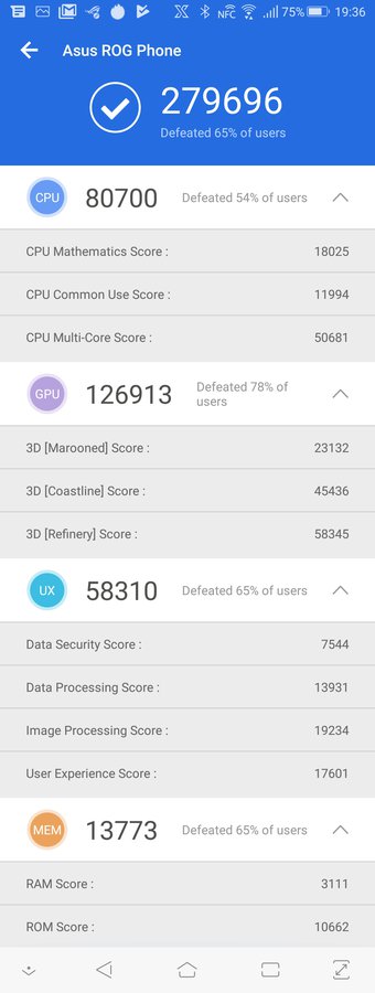 Il secondo benchmark è quello più diffuso su mobile, perché compatibile sia con Android che iOS, ovvero AnTuTu Benchmark. In questa serie di test Asus ROG Phone ha ottenuto uno score complessivo di 279696 punti. Su AnTuTu la CPU è riuscita a totalizzare un punteggio di 80700, 126913 punti per quanto riguarda la GPU, 58310 punti relativi alla User Expirience e infine 13773 per quanto riguarda le memorie.