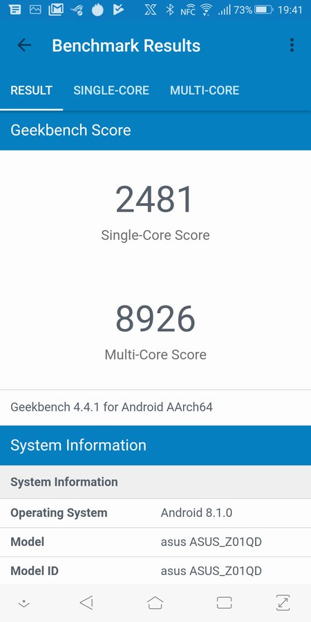 L’ultimo benchmark utilizzato è stato GeekBench, altro noto test disponibile sia su mobile, quindi Android e iOS, che su Desktop, quindi Linux, Windows e Mac. Lo score complessivo che Asus ROG Phone è riuscito ad ottenere è stato di 14156 punti. In single core siamo riusciti ad ottenere un punteggio di 2481, mentre in multi core di 8926.