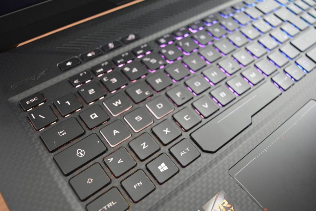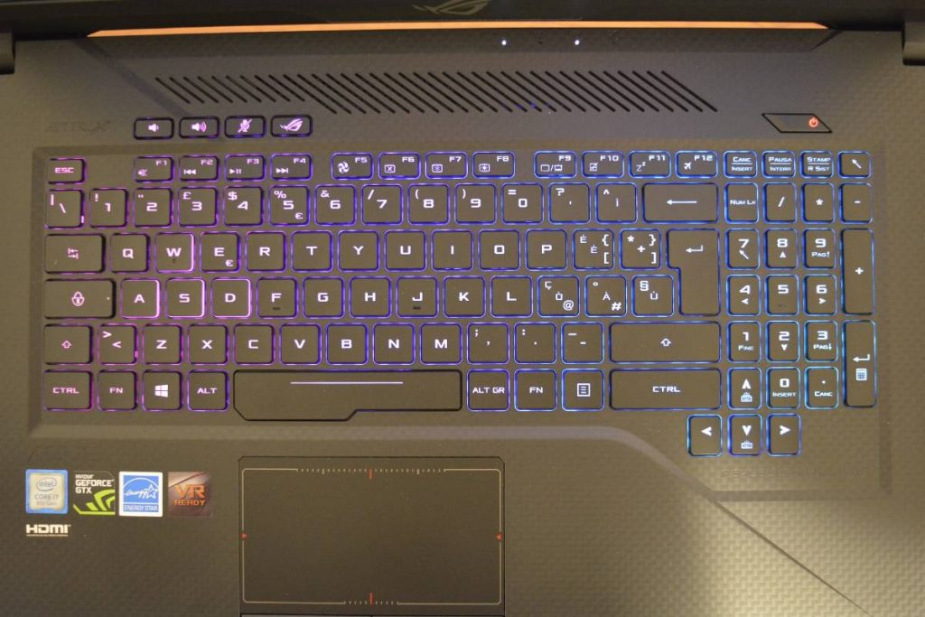 La tastiera è incastonata nel corpo del notebook dando così senso di continuità al design adottato da ASUS. Essa è dotata di retroilluminazione di tipo RGB in grado di riprodurre 16,7 milioni di colori. Tramite il software in dotazione possiamo selezione se impostare la retroilluminazione con colore statico oppure selezionare uno dei tanti effetti disponibili. La tastiera è di tipo chiclet ci ha davvero colpiti.