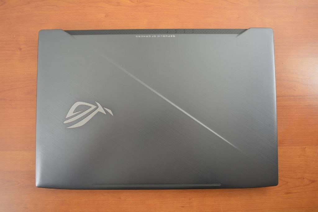ASUS GL703GM vanta un design molto aggressivo ed accattivante che sicuramente piacerà molto ai gamer odierni. Il coperchio del portatile è di alluminio spazzolato di colore grigio e sulla sua sinistra è presente il logo ROG che si illuminerà una volta acceso. Il resto del notebook è completamente in plastica, finemente lavorata per ricordare la fibra di carbonio.
