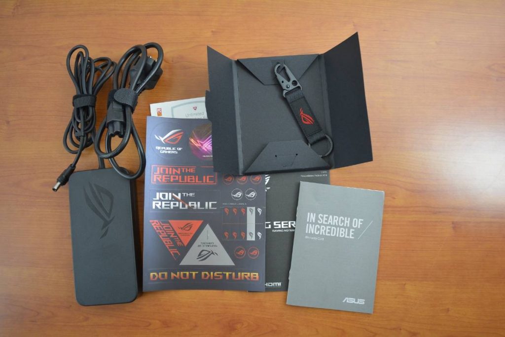 ASUS GL703GM ci viene fornito all’interno da una confezione brandizzata ROG, dove spiccano i colori tipici del brand, nero grigio e rosso, e l’enorme logo al centro. Al suo interno troviamo il portatile racchiuso da una busta di velluto, il caricatore da 19V/6,32 A, i manuali di istruzioni, diversi sticker e un simpatico portachiavi e tema ROG.