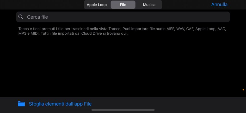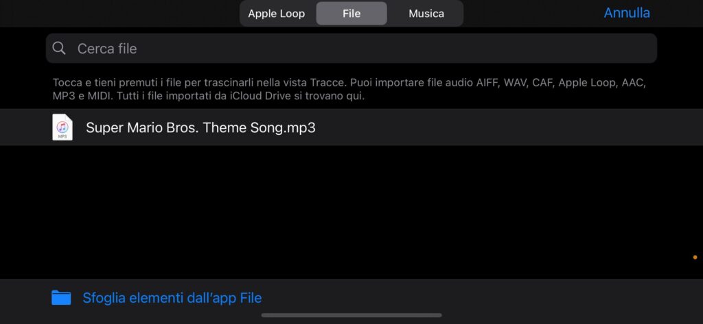 Premete sul pulsante di fianco alla rotellina delle impostazioni in alto a destra e quindi sulla sezione “File” in alto al centro. In basso troverete “Sfoglia elementi dall’app File”: cliccate e andate a selezionare il file mp3 salvato poco fa.