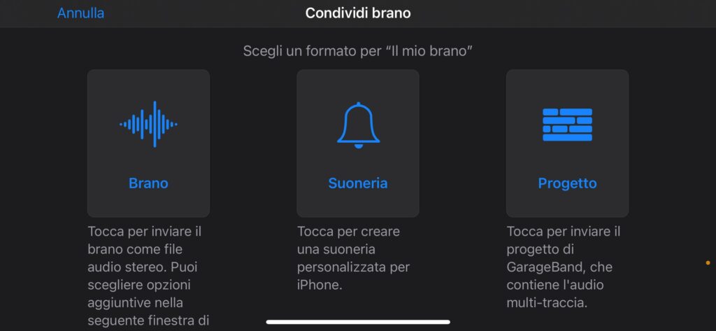 Una volta soddisfatti uscite tramite la freccia in alto a sinistra. Vi riporterà all’elenco dei vostri brani. Tenete premuto il dito sulla vostra creazione qualche secondo per far comparire il menu e selezionate “Condividi”. Cliccate su “Suoneria”, rinominatela come volete e premete il tasto “Esporta”.