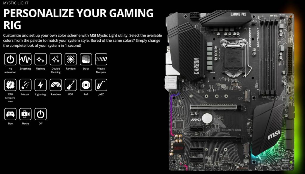 MSI B360 Gaming Pro Carbon è una scheda madre entry level di tutto rispetto. Nonostante non sia possibile overcloccare la propria CPU e non poter installare dei kit di RAM con frequenza maggiore a 2666 Mhz, il chipset B360 di Intel riesce comunque a fornire delle ottime prestazioni. L’hardware da noi installato, Intel I7 8700K e 32 GB di RAM Corsair Vengenace rispecchia a pieno il loro potenziale, ma sarà comunque limitato. La scheda offre inoltre la possibilità di installare fino a due unità SSD M.2, anche se non saranno dissipate. È possibile inoltre utilizzare le memorie Intel Optane per migliorare le performance degli hard disk meccanici qualora li vorreste installare. Come ogni prodotto da gaming che si rispetti, non può di certo mancare l’illuminazione RGB e il fatto di poter collegare i LED RGB e ARGB e di controllarli tramite MSI Mystic Light. MSI B360 Gaming Pro Carbon ha un design minimalista, impreziosito dalla pellicola di carbonio posta sui vari dissipatori.