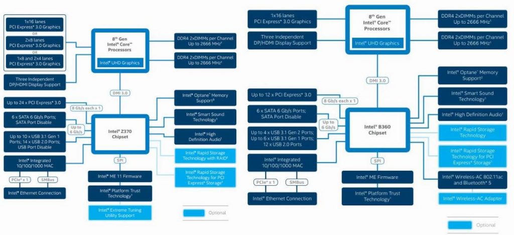 È prevista inoltre una sola linea principale da x16 collegata direttamente alla CPU. Troviamo anche un minor numero di porte USB – sempre rispetto a Z370 – e l’impossibilità di eseguire un RAID di dischi, ma troviamo il pieno supporto alla tecnologia Intel Optane.