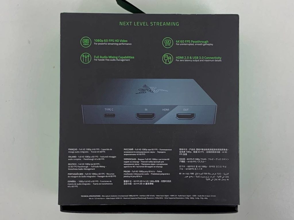 La parte frontale è caratterizzata da uno sfondo nero opaco, dove al centro spicca un’immagine frontale della scheda di acquisizione. Nell’angolo in basso a sinistra troviamo il nome del modello del prodotto, mentre in quello opposto vi è spazio per il caratteristico logo di Razer.