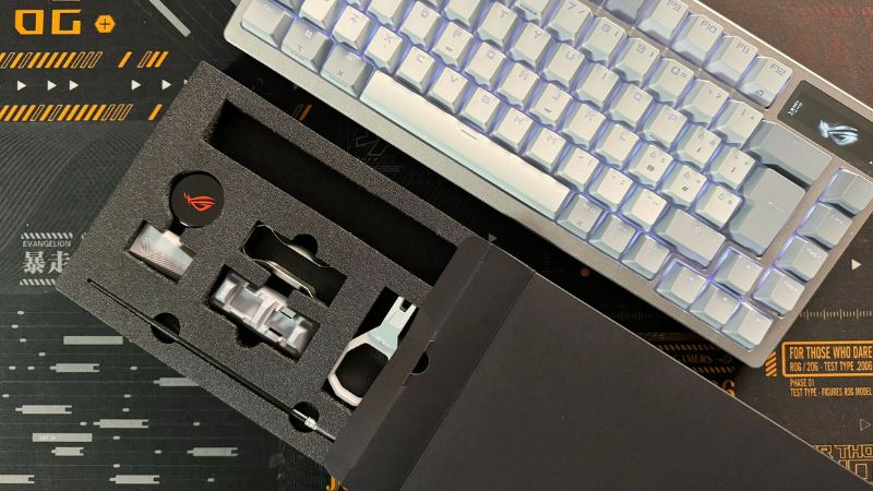 A catturare l’attenzione degli appassionati delle soluzioni fai-da-te è il ricco kit di manutenzione incluso nella confezione della ROG Azoth, un vero e proprio assortimento di strumenti pensati per semplificare la vita degli utenti e eliminare la necessità di ricorrere a materiale esterno. Asus arricchisce l’esperienza utente fornendo due pinzette, una per l’estrazione dei keycap e l’altra per gli switch. A ciò si aggiunge una piccola base versatile per aprire gli interruttori NX e MX, affiancata da uno stand trasparente in policarbonato per disporre gli switch estratti e aprirli agevolmente in vista della pulizia e lubrificazione. Pennello e lubrificante, anch’essi inclusi nella dotazione iniziale, completano il quadro degli strumenti per la manutenzione.