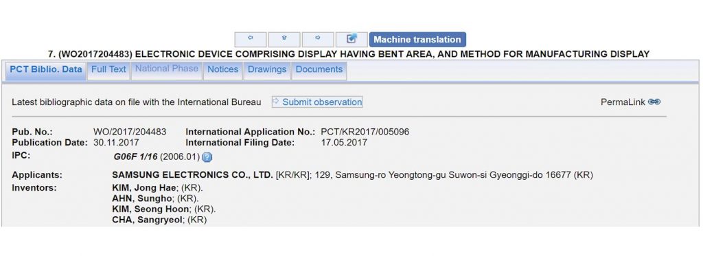Il 30 Novembre 2017, Samsung ha presentato un documento ufficiale grazie al quale si possono trovare tantissime informazioni su questo nuovo device. La prima grande notizia riguarda lo schermo, infatti secondo i documenti si tratterà di un display che andrà ad occupare il 100% della superficie frontale e grazie al brevetto di Samsung sulla curvatura dei display, quest’ultimo sembra che andrà a prolungarsi anche su tutte le superfici laterali e sugli spigoli, e si ipotizzano già tasti del volume virtuali e spostamento del tasto di accensione direttamente sul retro.