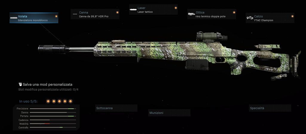 In questa configurazione avete un’enorme controllo e anche un’ottima portata. Alcune modifiche possono essere effettuate sul laser che essendo visibile ai nemici a qualcuno potrebbe non piacere, esso può essere sostituito con un bipede o con “Prontezza di spirito”, specialità arma che vi permette di trattenere il respiro più a lungo.