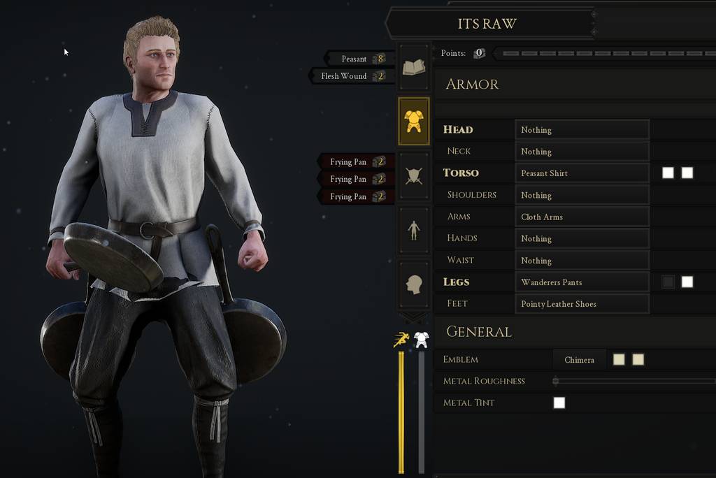 La padella non è infatti disponibile come arma di partenza. Per poterla utilizzare bisognerà caricare il proprio personaggio, successivamente cliccare sul menù Vantaggi in alto a sinistra e selezionare Contadino (vi costerà 8 punti). Ora potrete utilizzare solamente armi e armature tipiche dei contadini, tra cui anche la famigerata padella.
