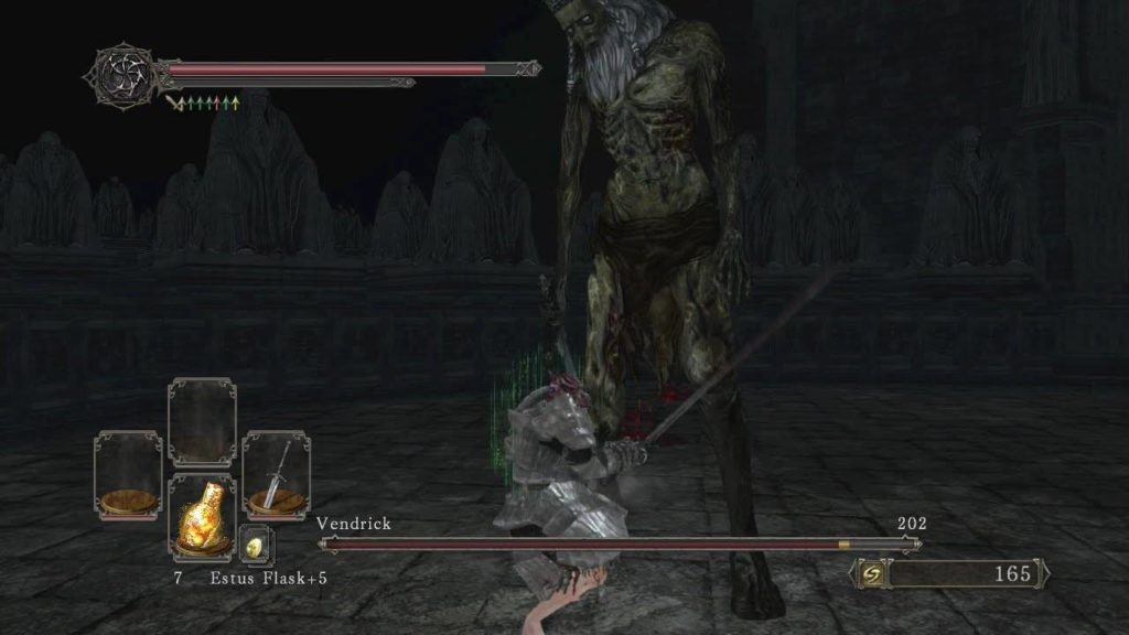 In Dark Souls II Re Vendrick è un boss opzionale non eccessivamente complicato, e si mostrerà nettamente più facile se riuscirete ad accumulare quante più Anime dei Giganti possibile. Esse sono reperibili nei ricordi dei Giganti (tra cui quello in cui trovate il Signore dei Giganti come boss), come drop del Drago Antico e dei due Giganti nella Gola Nera. Fatta questa premessa, sappiate che anche qui vi servirà molta pazienza e non dovrete essere avidi con gli attacchi. Non colpitelo troppo e cercate di stare alla sua sinistra, punto in cui alcuni dei suoi colpi non vi prenderanno ed eviterete che salti all’indietro. Se avrete bisogno di curarvi, aspettate che il boss attacchi e poi curatevi. Non scappate lontano da lui perché vi raggiungerà senza dubbio e ve la farà pagare cara.