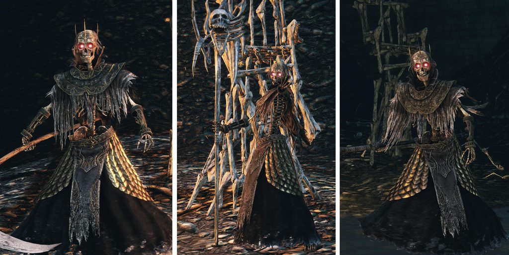 La saga di Dark Souls è piena di scherzi del destino, e i Signori degli Scheletri non fanno eccezione: anche loro umani una volta, anche loro hanno dovuto fare i conti con la maledizione e diventare ciò che hanno cacciato per tanto tempo, tanto da diventare comandanti della stagione di caccia in salsa non-morta. Ridotti a una vestaglia purpurea svolazzante e due occhi rossi essi hanno dimenticato la loro vecchia missione e la loro fedeltà al re e, abbandonati al loro marciume, sono rinati con un’altra: creare un regno di ossa indossando tre corone di eguale fattezza.