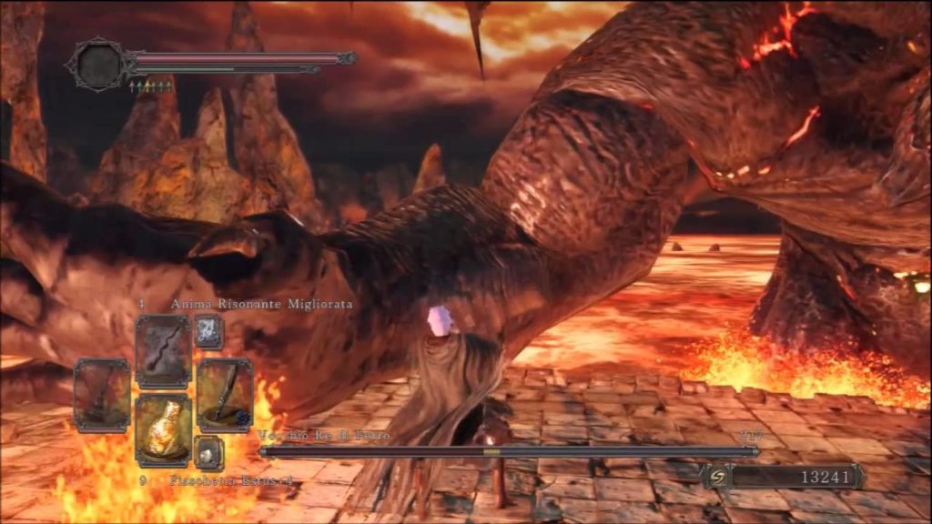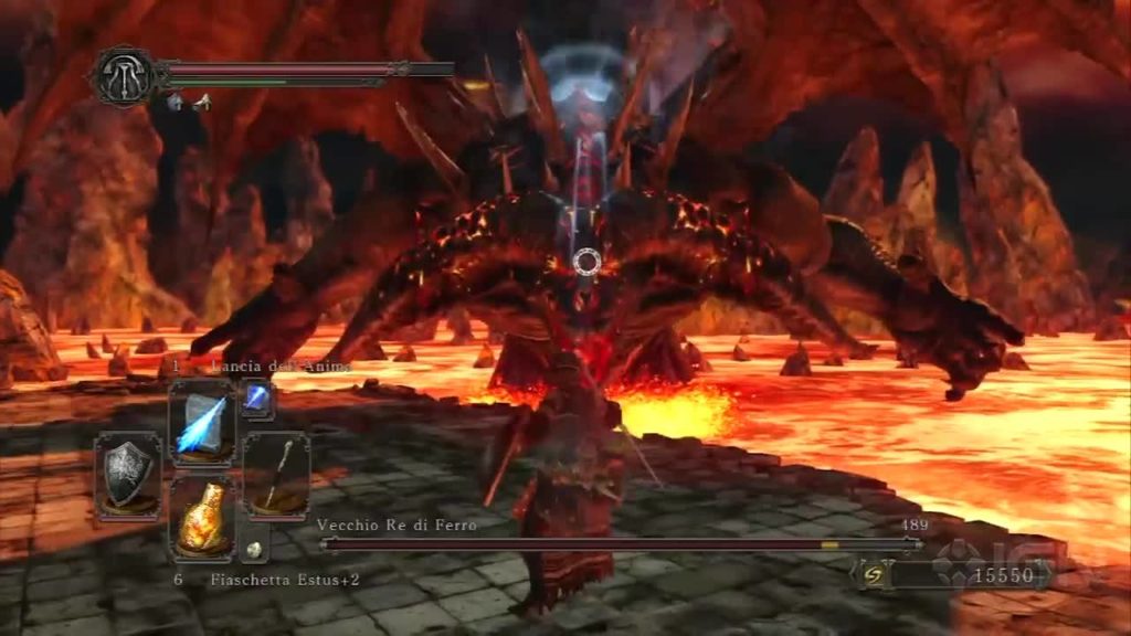 Appena entrati nell’arena, vi troverete di fronte a un terreno ostile: sarete su una penisola circondata di lava, con davanti un enorme boss capace di infliggervi danni ingenti e buttarvi di sotto, uccidendovi. Correte immediatamente verso la parte destra dell’area, in modo da trovarvi faccia a faccia col Vecchio Re di Ferro, uno dei quattro “Antichi” di Dark Souls II. Una volta in posizione, seguite le semplici istruzioni che vi lasciamo qui sotto e riuscirete a cavarvela.