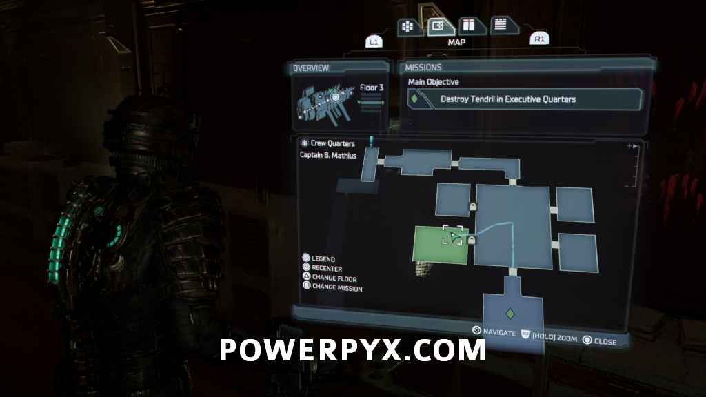 Prendi la Tessera di Sicurezza Esecutiva dai Bagni Esecutivi poi usala per accedere alla stanza del Primo Ufficiale White (sulla mappa, la targetta è diversa). Spara al fusibile su muro poi entra la stanza del Capitano Mathius, il nodo lo trovi sul muro di destra.