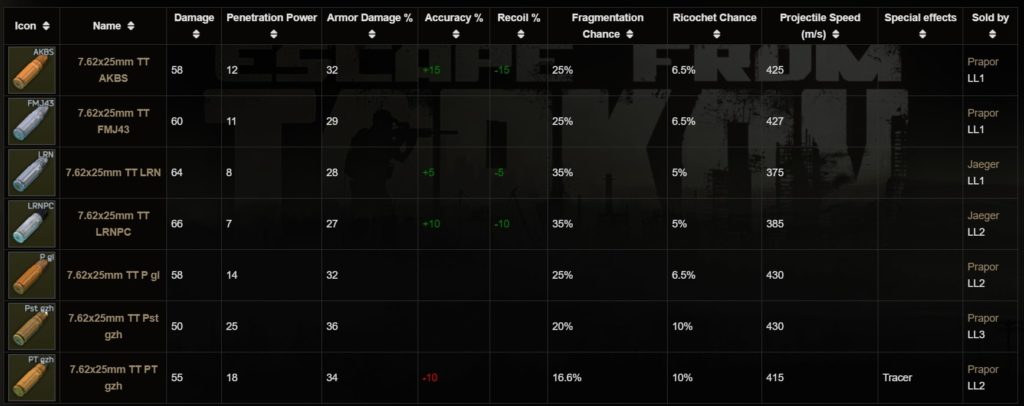 In questa guida si selezionano in ordine di potenza penetrativa le migliori munizioni calibro 7.62x25mm Tokarev presenti in Escape from Tarkov. Esse vengono utilizzate dalle pistole TT e TT dorata.