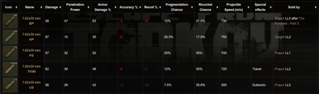 - 7.62×39mm T45M. Infliggono un danno pari a 62 e hanno una potenza di penetrazione pari a 31.