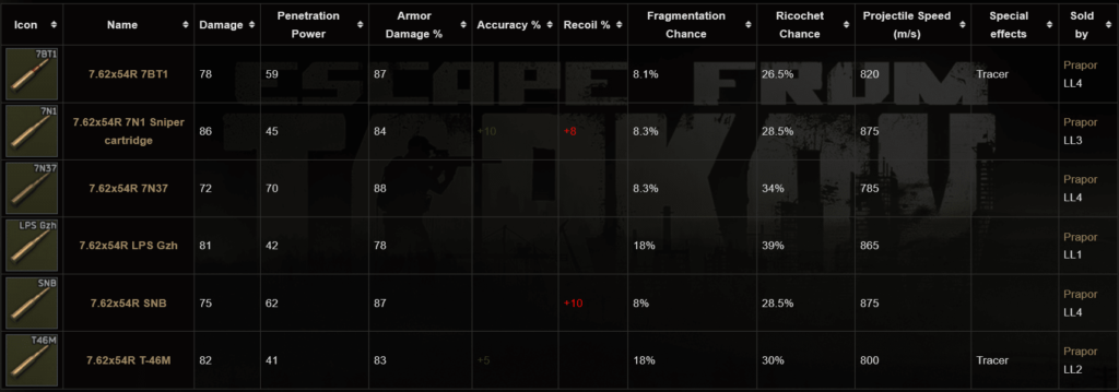 - 7.62×54mmR 7N37. Infliggono un danno pari a 72 e hanno una potenza di penetrazione dell’armatura pari a 70.