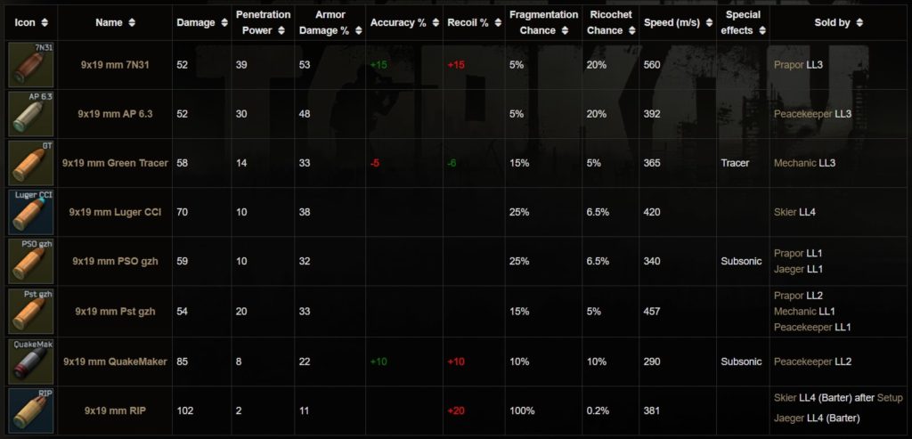 In questa sede vi proponiamo una guida in cui si selezionano le migliori munizioni del calibro 9x19mm presenti in Escape from Tarkov, gioco prodotto attualmente per PC e che in futuro arriverà anche su Steam. Le munizioni in questione sono utilizzate dalle seguenti armi: Saiga-9, PP-19-01 Vityaz-SN, MPX, MP9-n, MP9, MP5K-N, MP5, P226R, MP-433 “Grach”, M9A3, GLOCK18C, GLOCK17.