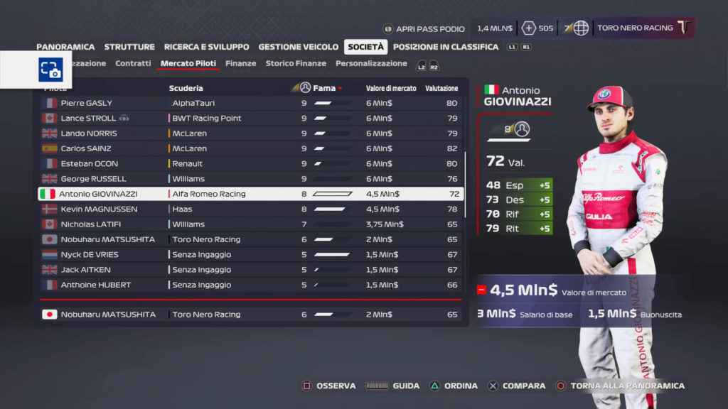 Posizione 19 – Antonio Giovinazzi, Alfa Romeo Racing, Ovr. 72